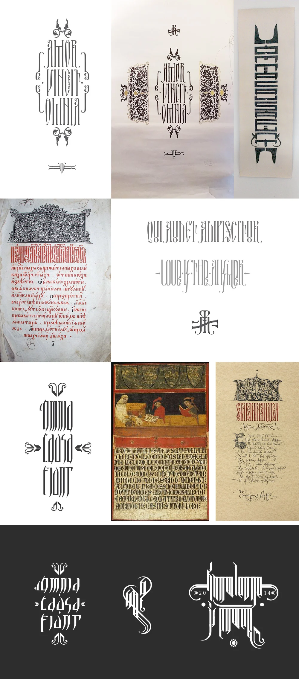 I have been researching for long time ancient manuscript typography focusing on the evolution of the letters across centuries, particularly on Cyrillic books and pergamenae. These are some of the results along with inspiration sources.