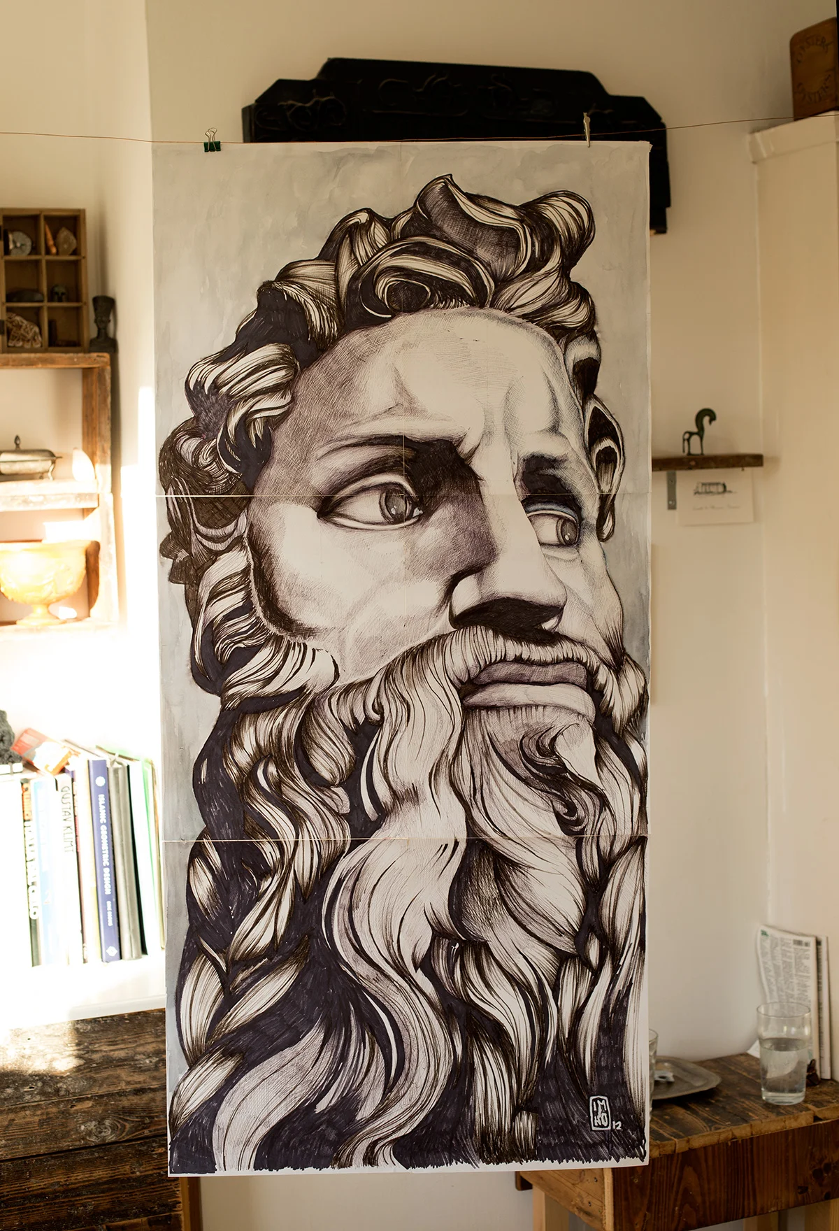 Inspired by the great sculpture of Michelangelo I have been drawing the Moses with byro pen. The drawing has been recently published on the cover of "Le chantier du Pentateuque" (Lessius publishing)